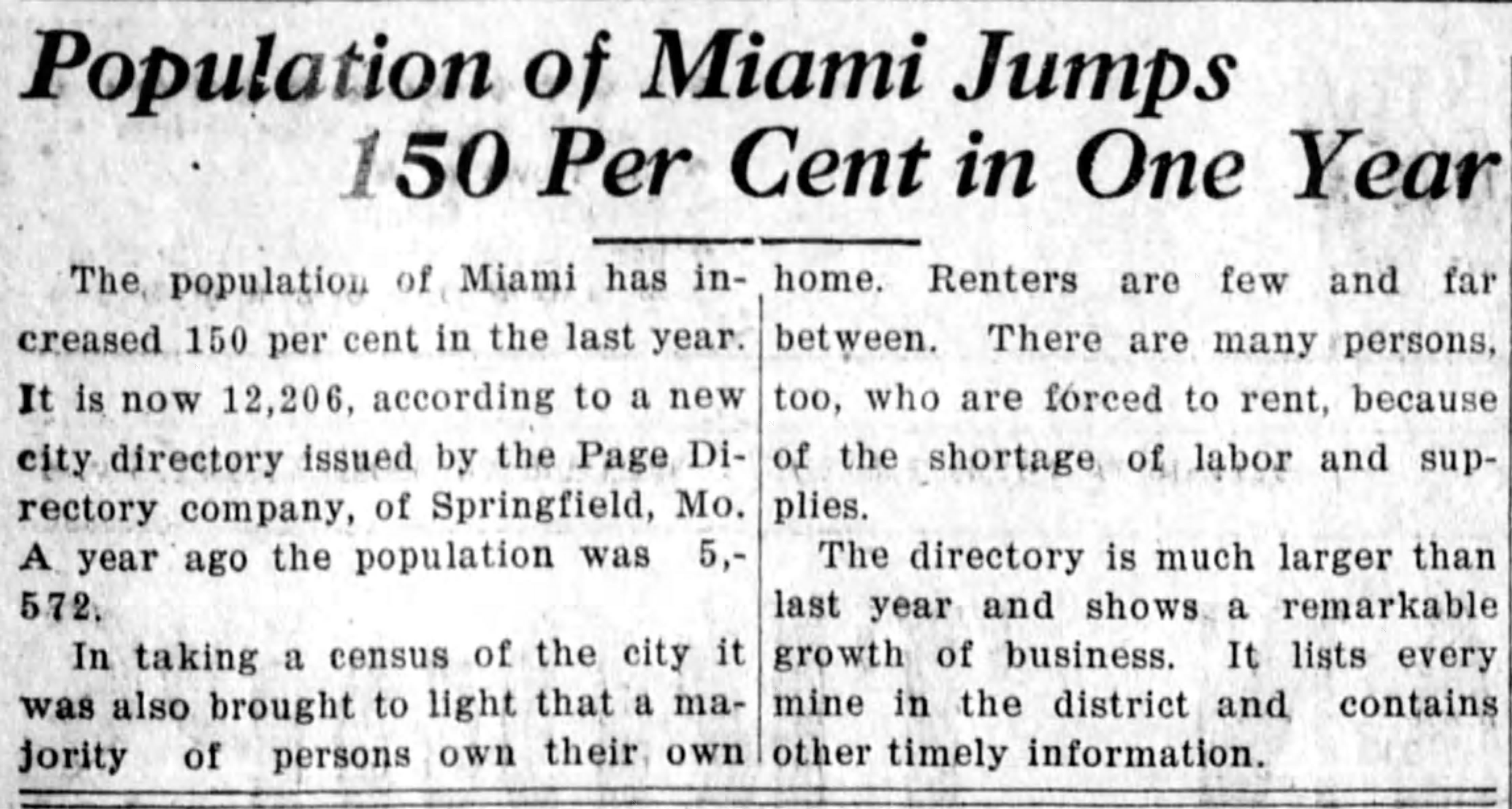 The Year in Review - News - The Miami News-Record - Miami, OK from www.miamiok.com Miami reached it's highest population of 14,237 in 1980. Compare population statistics about miami, ok by race, age, gender, latino/hispanic. The population of all places in oklahoma by census years.